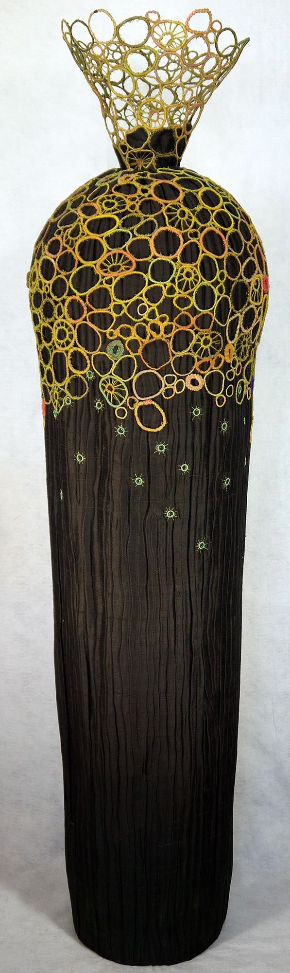 Busby trained as a ceramicist. After spending years running a business creating in clay, she turned to fiber art. This piece is part of a series exploring the vessel form in cloth, returning to forms that she had explored in clay. The monumental size gives presence to the sculpture while the materials allow for a variety of surface textures.