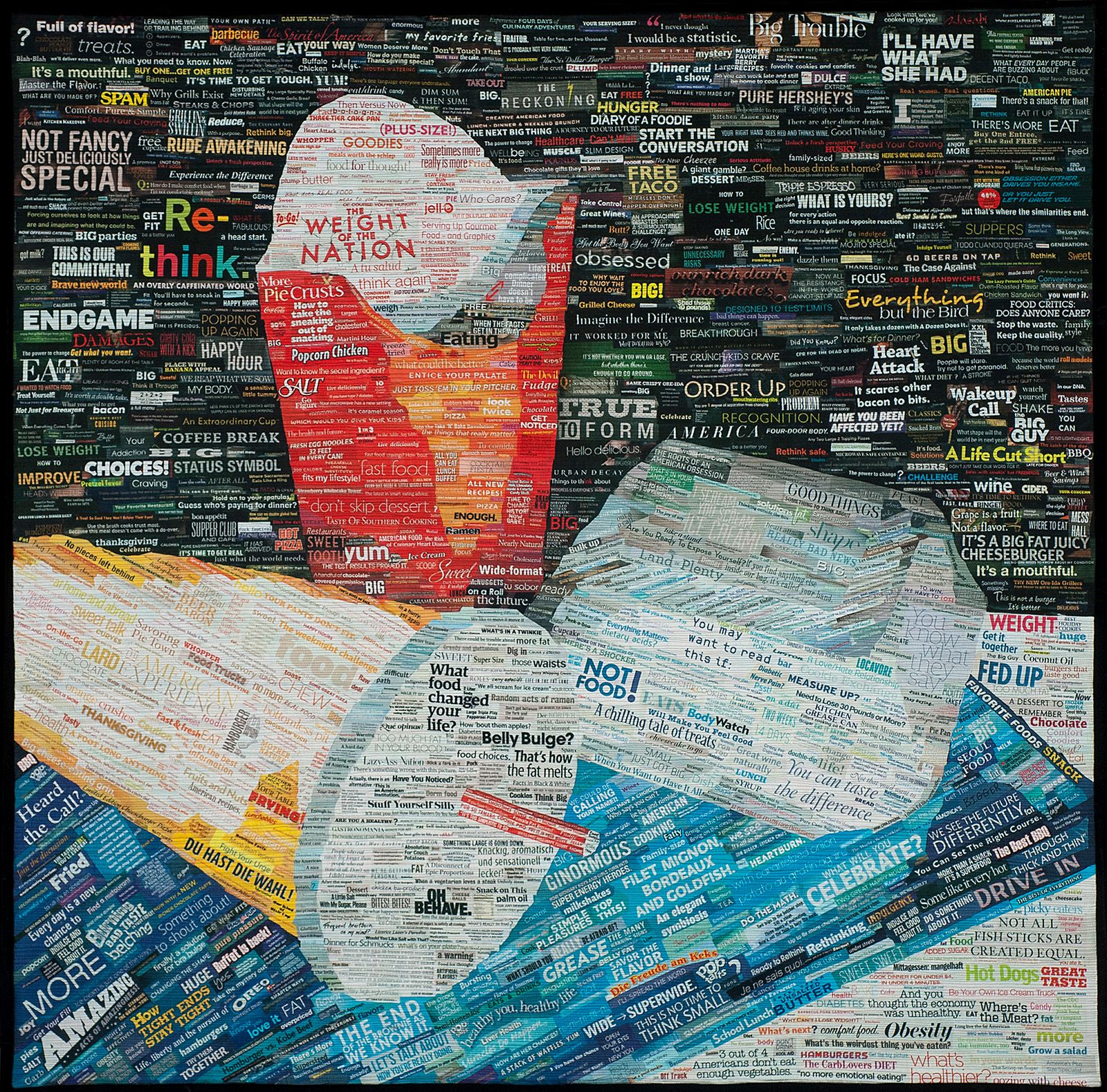 The Pixeladies (Kris Sazaki and Deb Cashatt) create art work with words and phrases cut from newspapers and magazines, collaged on paper, then scanned and printed on fabric. The resulting whole-cloth quilt is then heavily quilted by machine or hand. The artists combine their keen sense of humor and love of language to make powerful social or political comments.