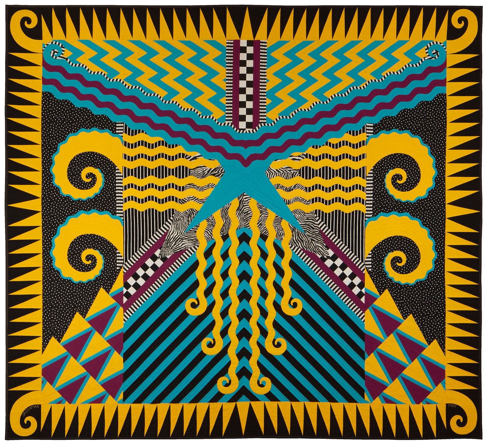 An early exploration of the stylized natural forms that continue to inspire her work, this quilt showcases waves, sharp triangles, and spirals in a symmetrically mirrored design. The triangles of the motifs here return as thorns in Sassaman’s later works, the spirals as fern fronds, and the waves as intertwining stems.
